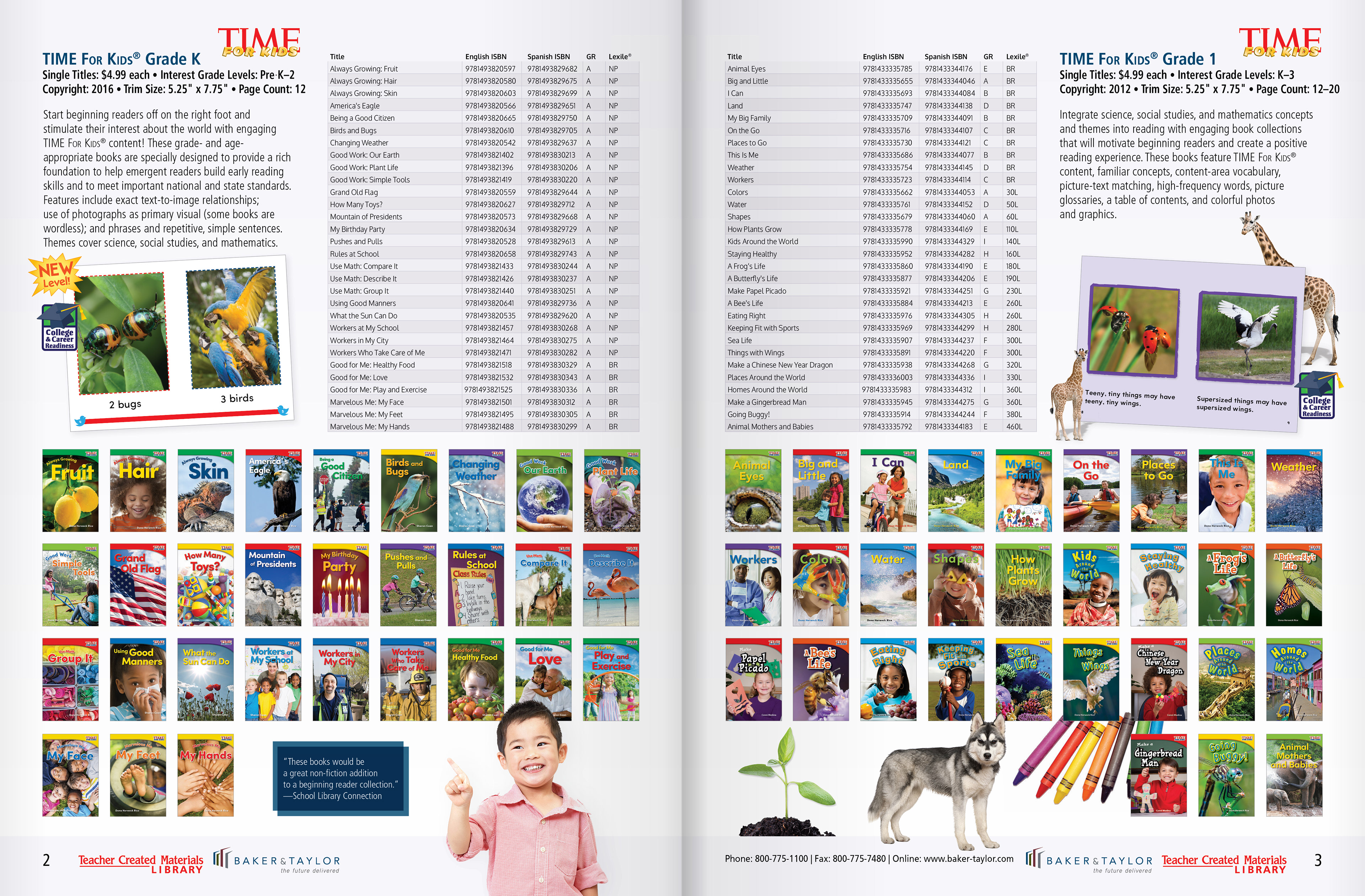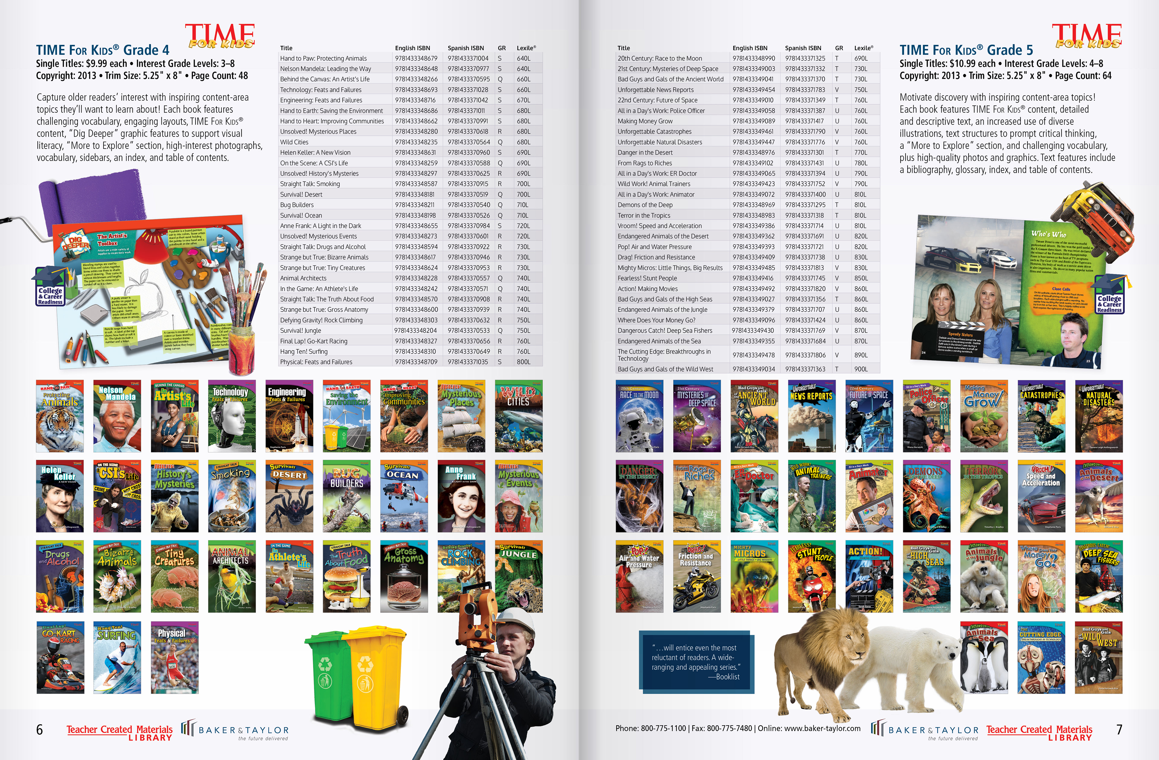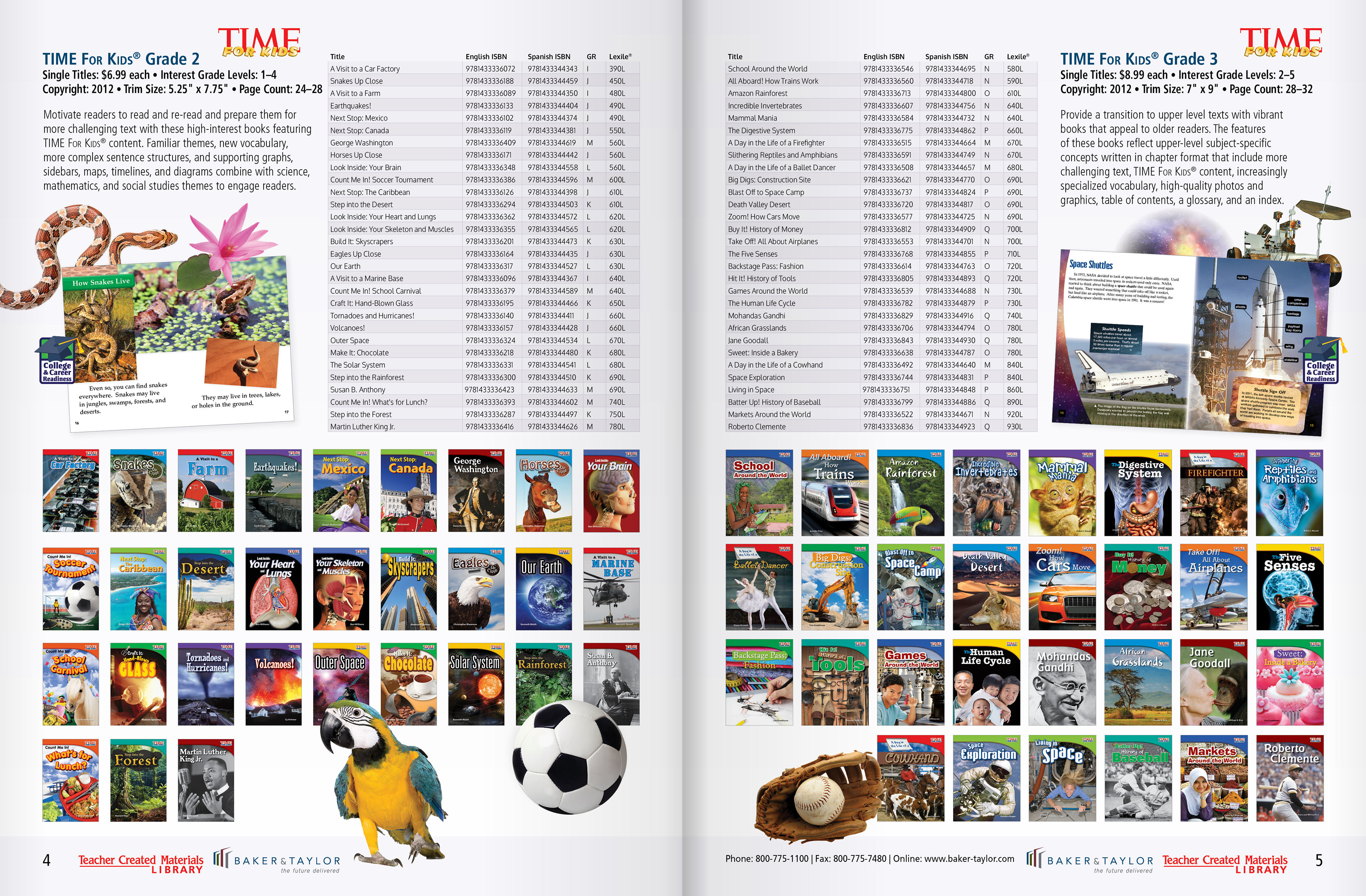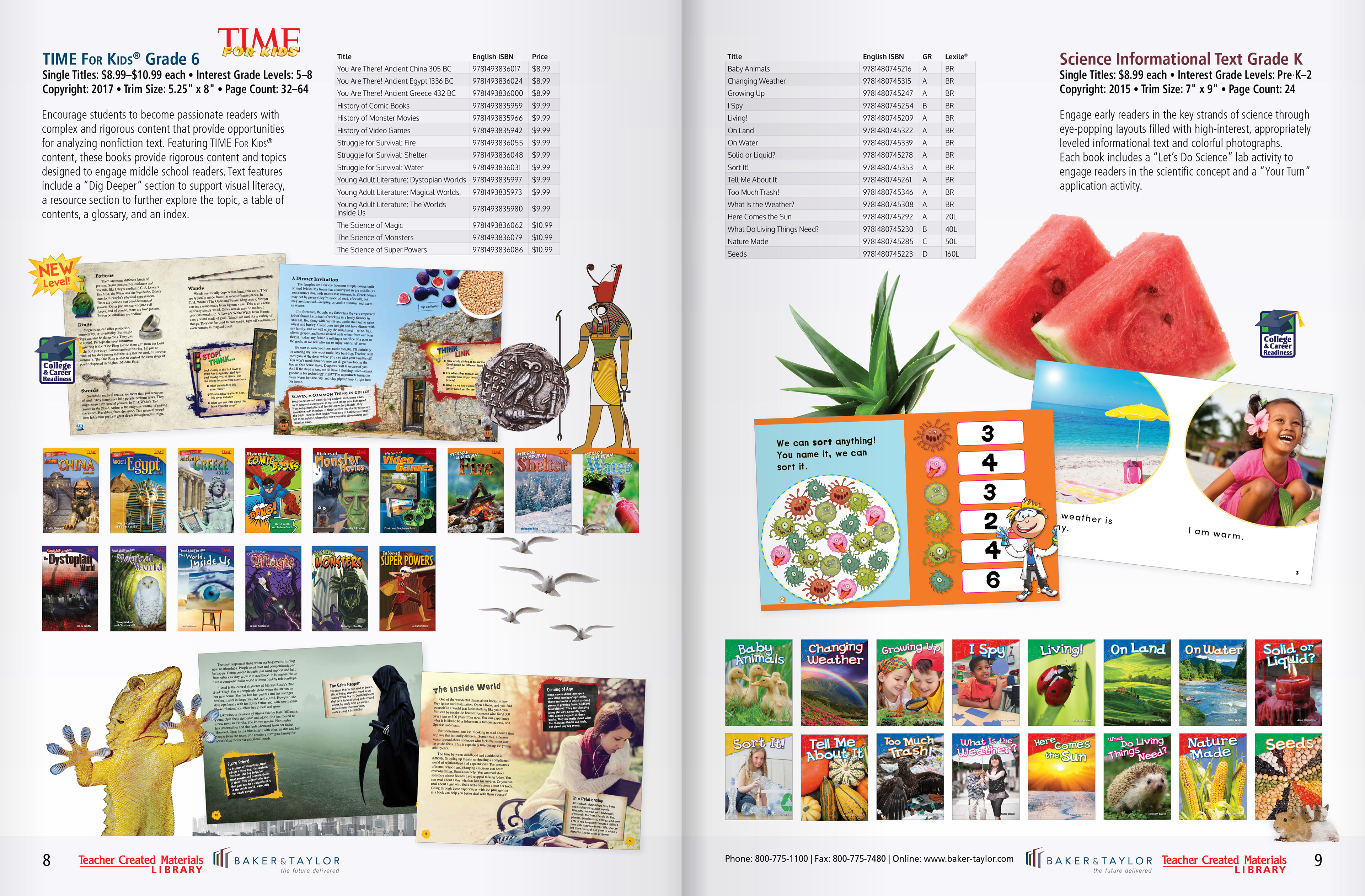 Print brochure for Teacher Created Materials B2B, showcasing Science and TIME For Kids readers for K–5 students.