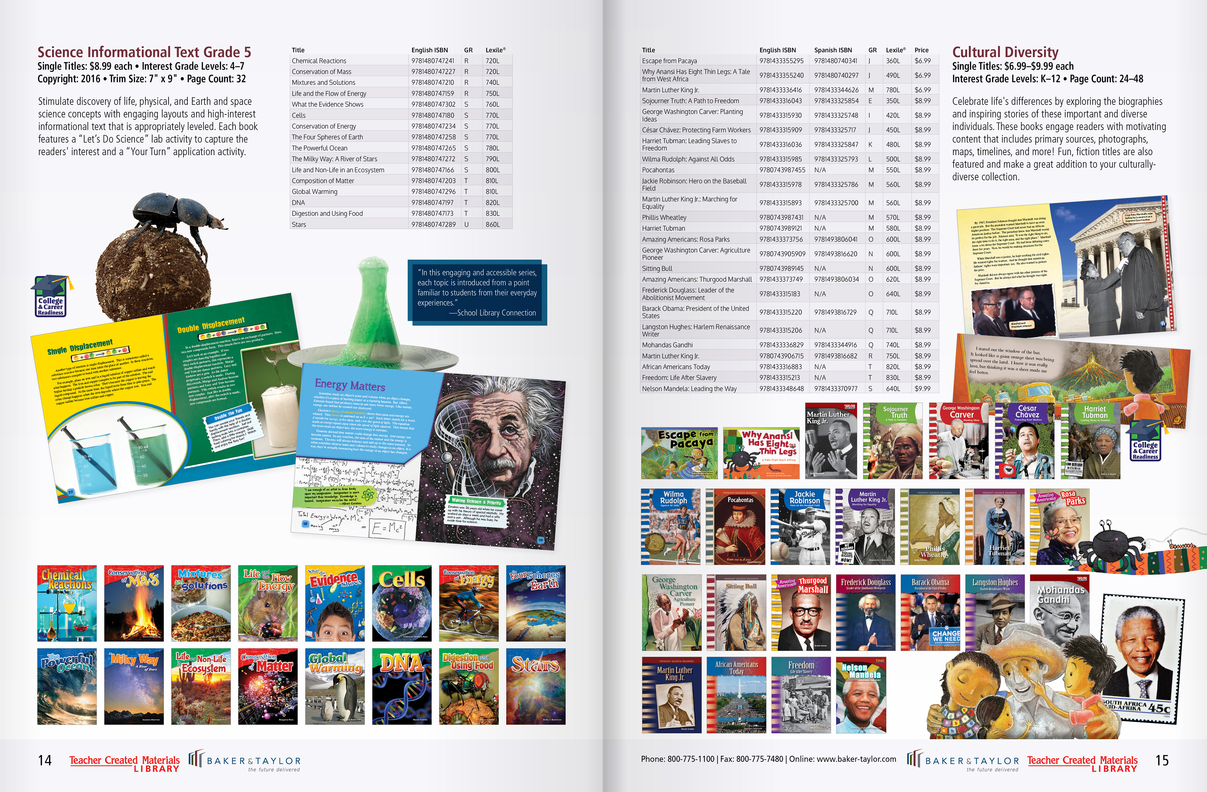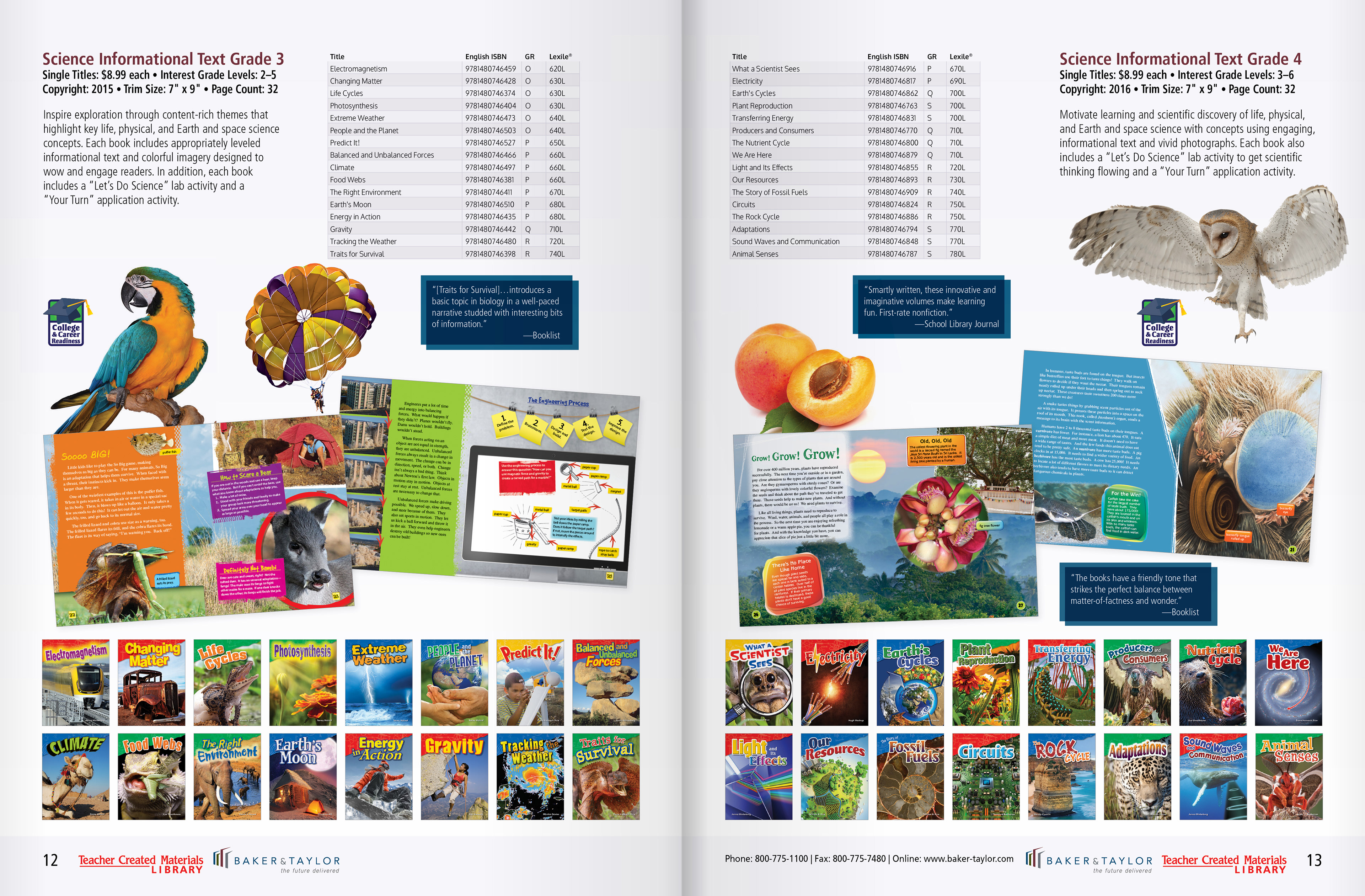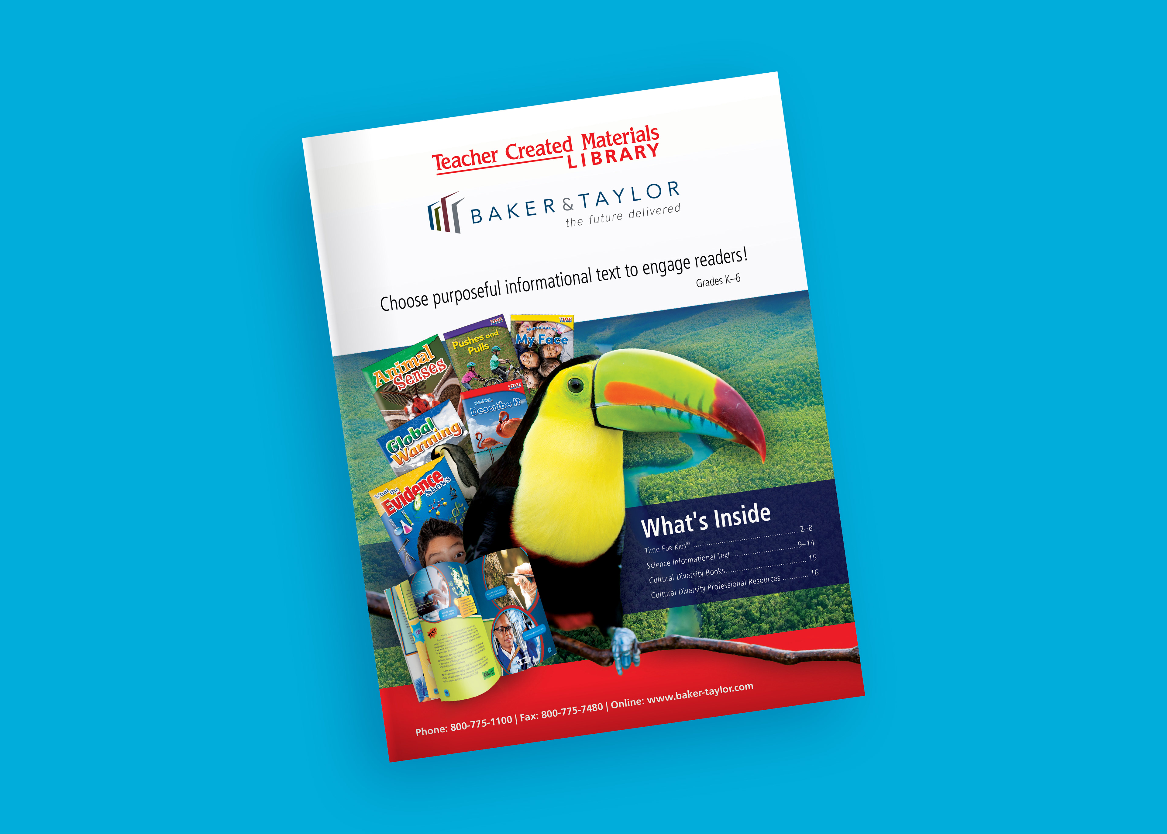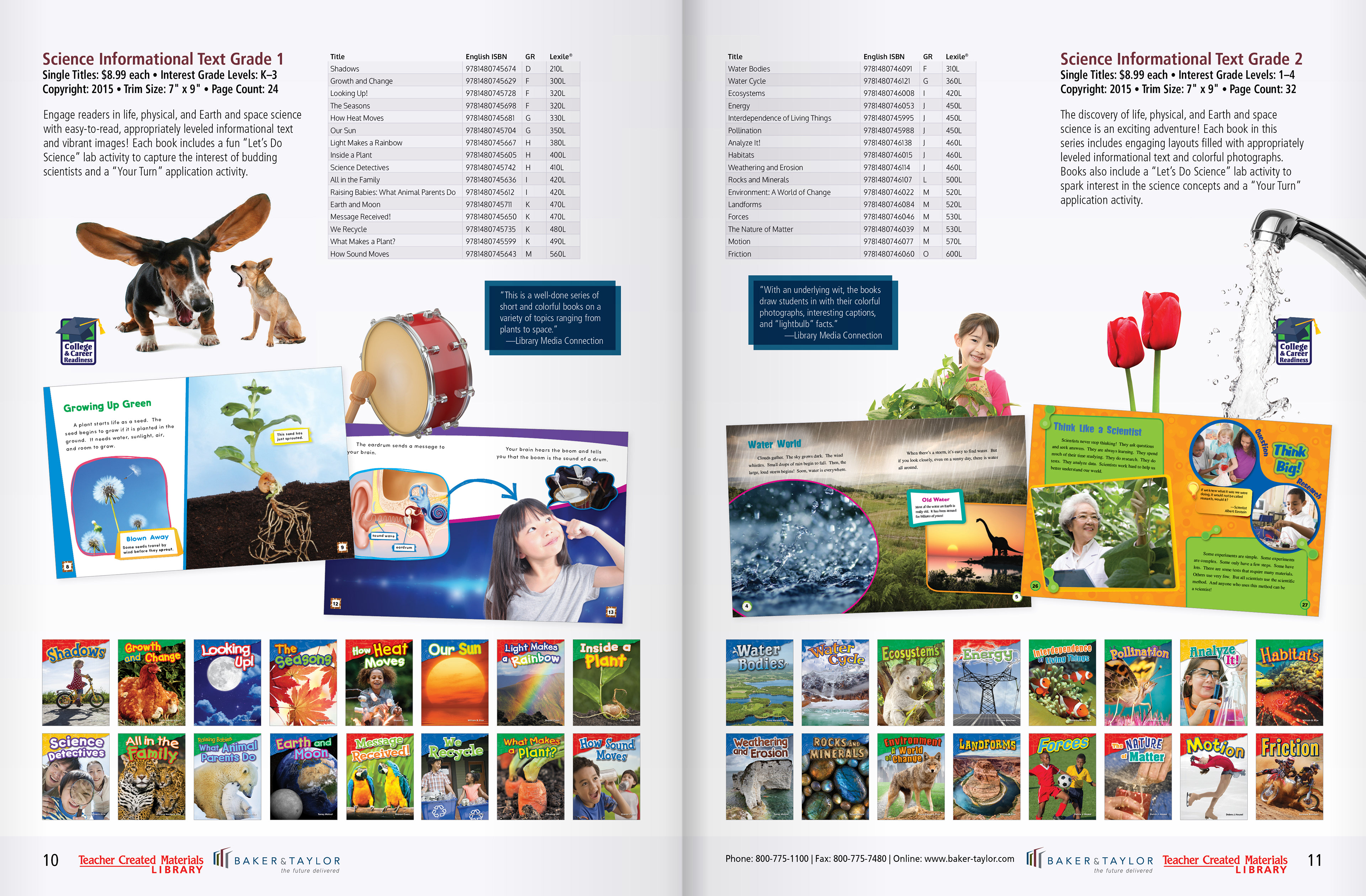 Print brochure for Teacher Created Materials B2B, showcasing Science and TIME For Kids readers for K–5 students.